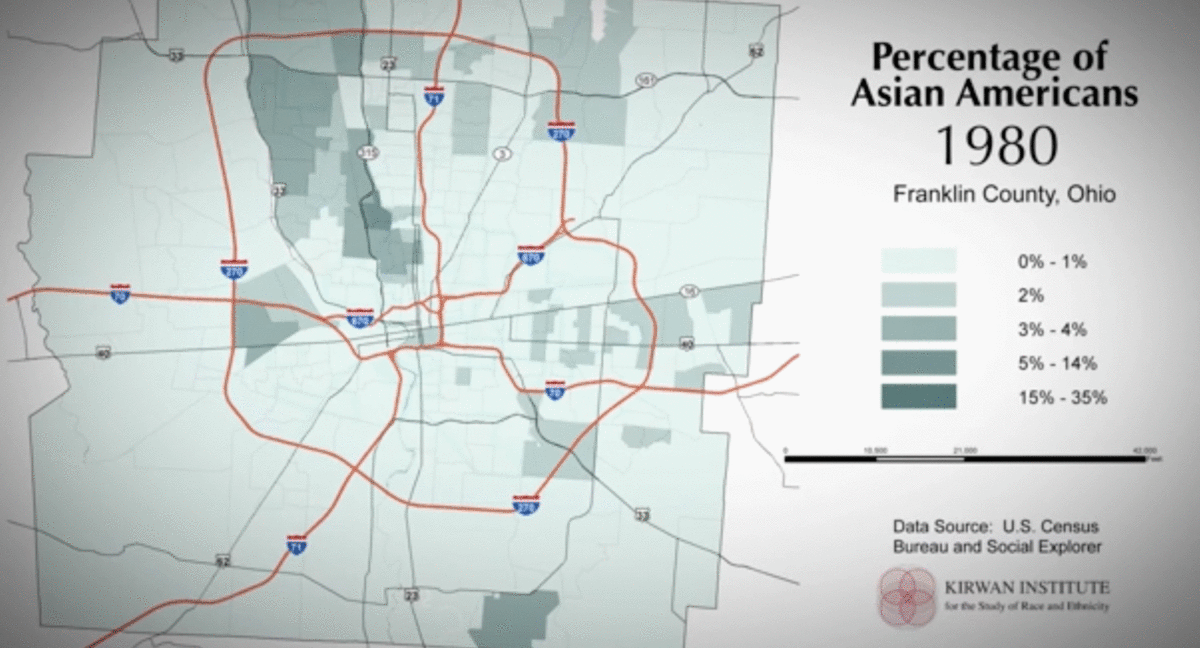 We’re technically minorities yes (frankly an odd term for the majority of the world), but we go straight to the white parts of town. Look at this map of Asian migration to Columbus, and remember the color line running down I-71.