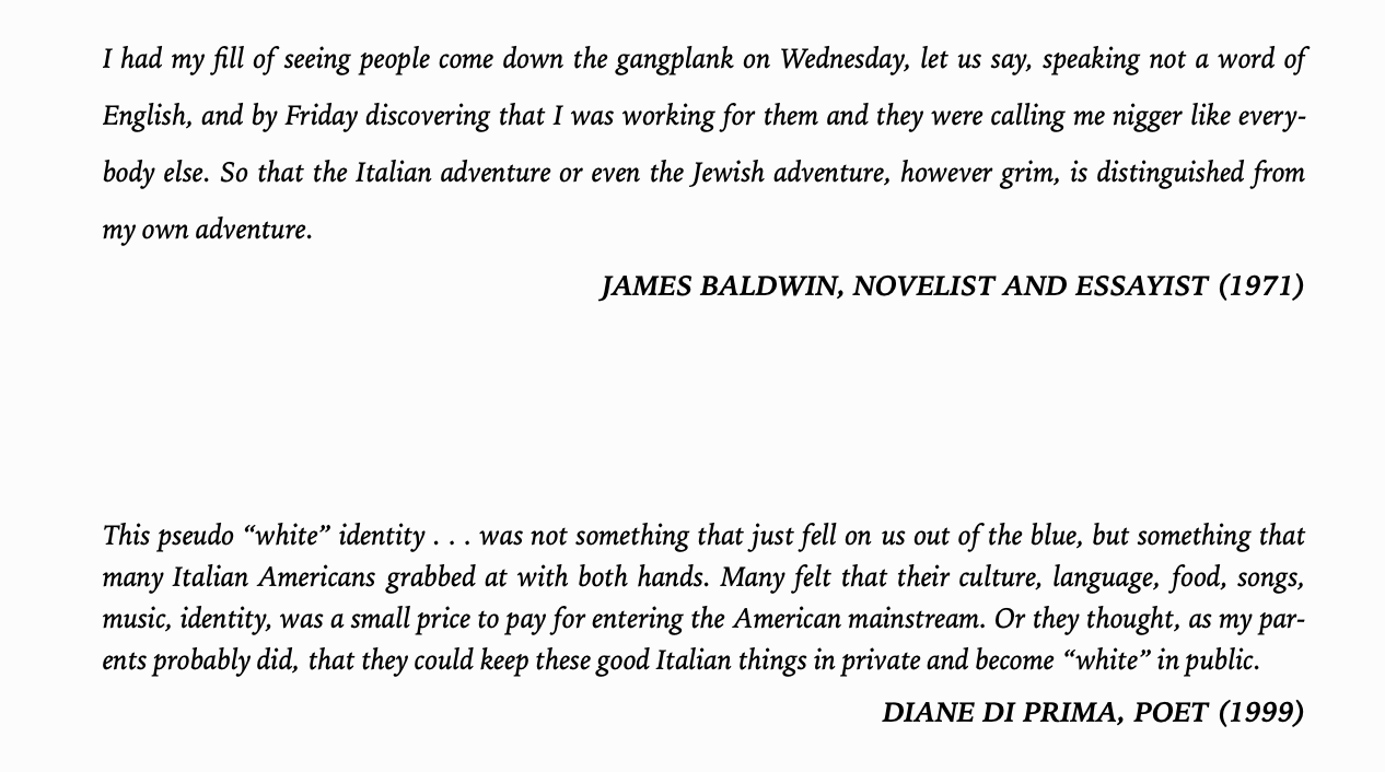 We think of white as some fixed identity, but it’s not. Germans, Irish, Italians— these were not always white people. As David Roediger, writes, they ‘worked towards whiteness’. Basically, they stood in a queue. They worked, became cops, politicians, until they became white.