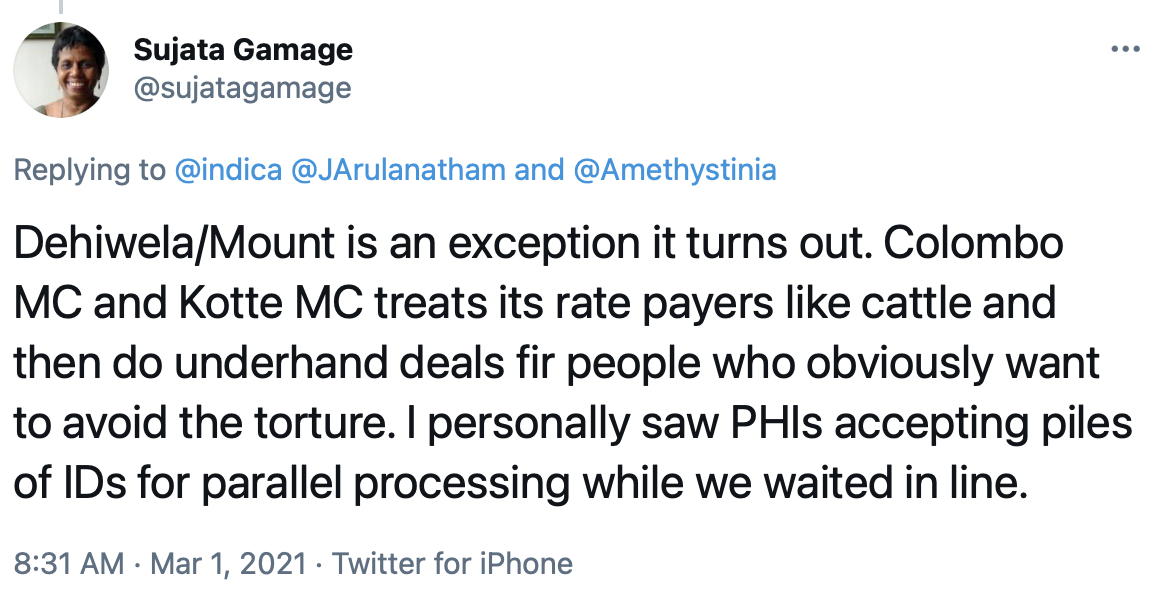 Basically, they took our word on it. They ask you 40 times, but if you’re willing to lie 40 times you could get injected there. We came with my in-laws cook and driver, and they have no proof of residence in Kohuwala at all. They still got through fine. The officials just keep asking if you live there, and people seem to tell the truth and bounce themselves.