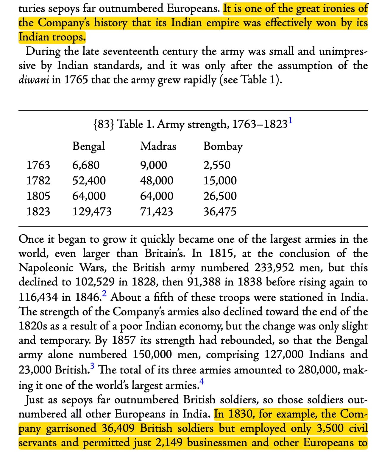 The EIC armies were initially small and were never very good. As Barrow said, “The Company did not have significantly better troops, training, or weapons, especially when factoring in the distance between Britain and India.” For much of its existence, the EIC armies had no cavalry, was divided both internally and territorially, and officers were promoted based on seniority, meaning it was largely led by morons. What the EIC did have, however, was the strategy of divide and conquer, which can overcome all sorts of tactical foibles.
