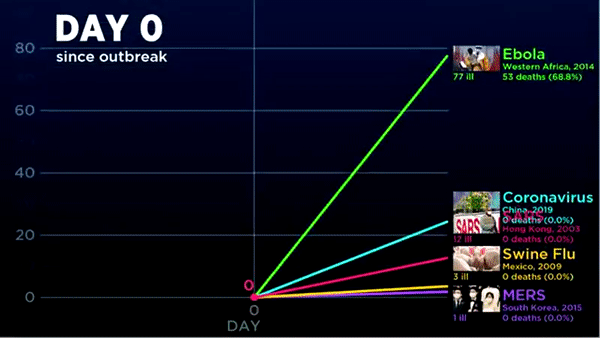 This GIF cut from a video from Abacaba shows the growth rates of various viruses. As you can see, COVID-19 looks pretty quiet until around day 20, when it goes ‘viral’. Where the GIF cuts off, you can see the 2009 Swine Flu begin to take off. That disease eventually infected 10–20% of the global population. Luckily, its fatality rate was 0.01–0.08%, less than the flu.