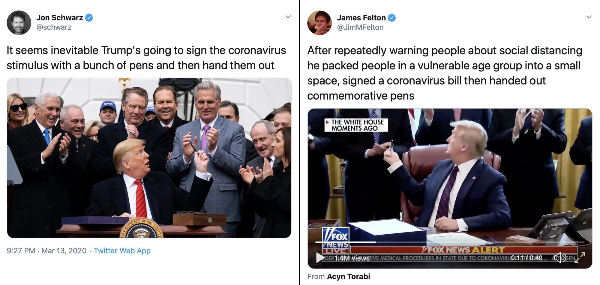 And of course, his actions are as bad as his words. Trump has encouraged shaking hands. He has not self-quarantined after coming in contact with infected people. Even after the signing of a relief bill he gathered a bunch of old men close and handed out commemorative pens.