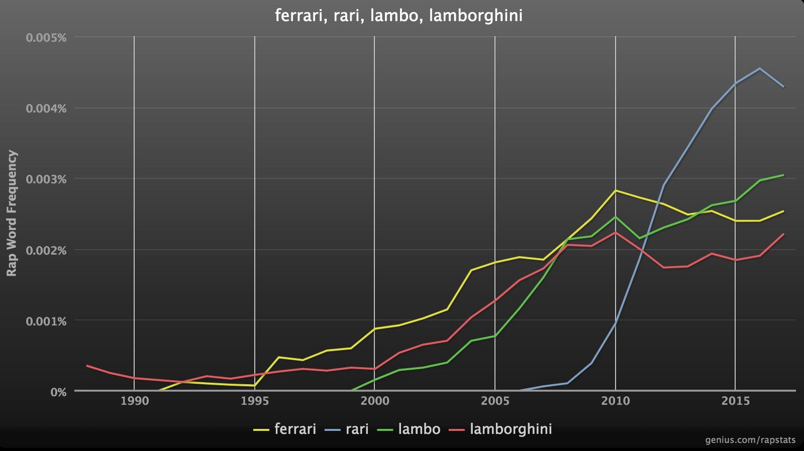The final trend that also gathered steam in around 2004 was the transition from standard luxury cars like Beamers and Benzes to more niche supercars like Ferraris (Raris) and Lamborghinis (Lambos). Gone are the days of Wu Tang rapping about hopping out Mazda minivans. Today it’s all about hopping out coupes.