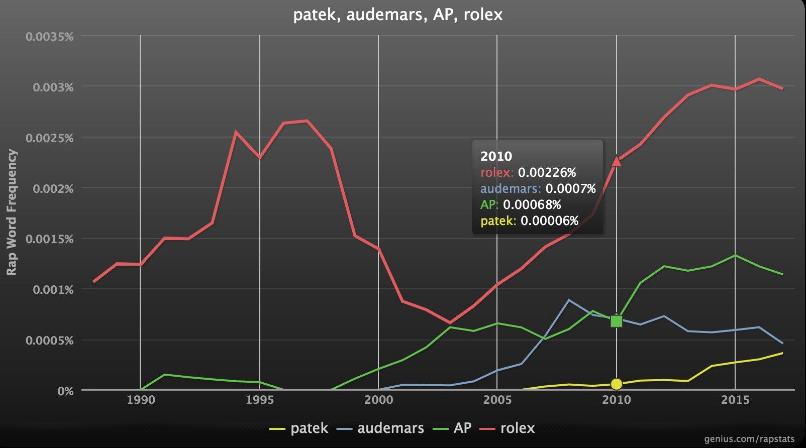 Around the same time, taste in watches evolved. Anybody that gets money knows Rolex, but around 2003/2004 rappers started to cotton on to the true watches of the 1% —lesser volume brands like Patek Philippe and Audemars Piguet.