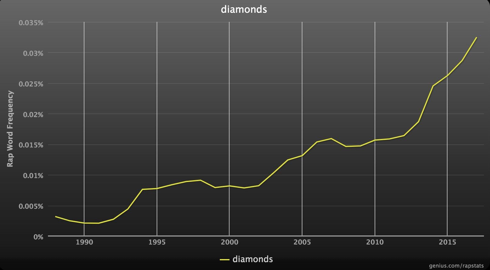 Finally, around the same time, rappers moved on from gold chains and diamonds became an obsession. For busting down watches or wearing as tennis chains, bracelets, cuban links. Diamonds don’t actually have much resale value, but being dripping with ice became de rigeur.