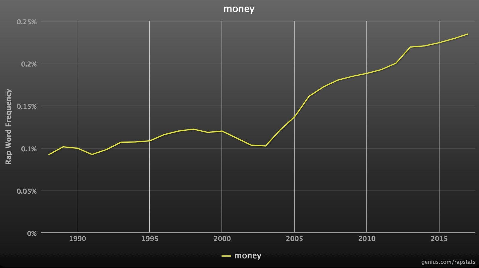 The frequency of the word ‘money’ in rap lyrics has more than doubled since 2004. Of course, hip-hop has always talked about money, but at some point it became central. Displays of wealth are now vital filler to any rappers oeuvre, as essential as flowers to Monet.