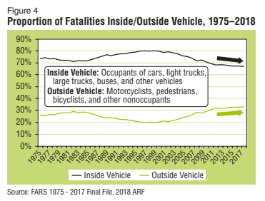 While cars are becoming more armoured and safer for the people inside, they are becoming more and more dangerous for the soft bodies outside. In the US, deaths inside the vehicle are decreasing, but pedestrians and cyclists are getting murdered at a higher rate.