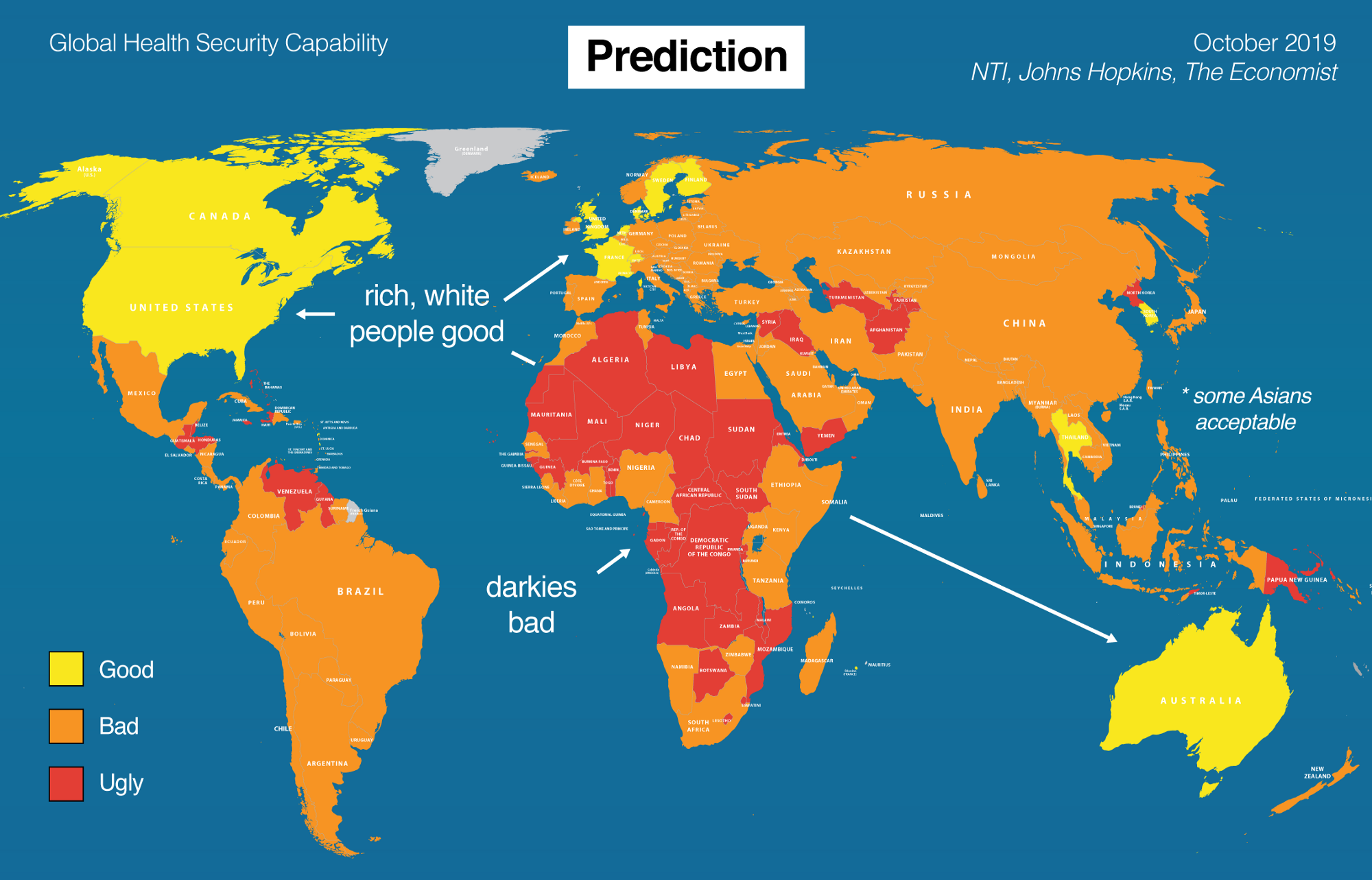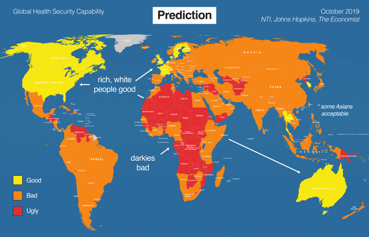 This report might as well have been called The Physical Impossibility of Pandemic in the Mind of Someone Western. The final results are, as mentioned, just a map of the ‘developed’ world vs. the developing, with some gradations around Europe. Even those were completely wrong, they noted the UK, Sweden, and France as the best prepared, while they were the worst.