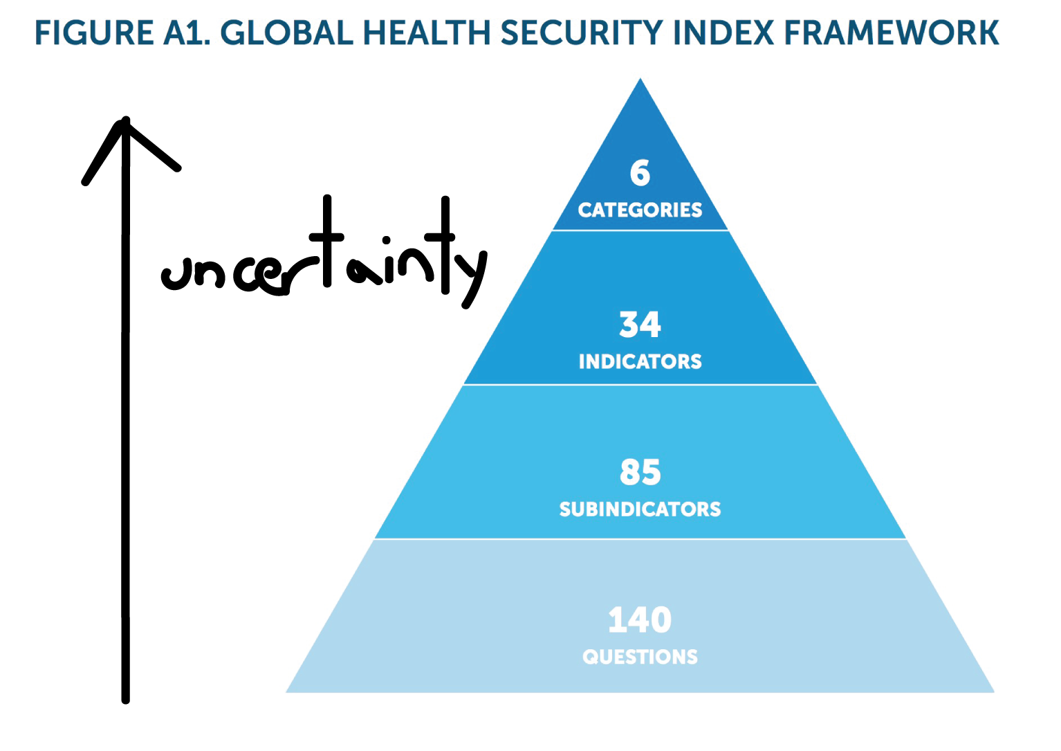You can download their Excel and look at it. It’s a rat’s nest. They’ve taken 259 (!) indicators, weighted them (11.2% for travel restrictions, OK, why?), and then weighted them again at the category level (19.2% for rapid response, OK, why?). This is complete garbage. It’s just a pyramid of uncertainty.