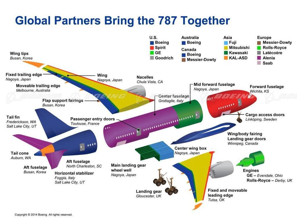 Boeing didn’t outsource just the manufacturing of parts; it turned over the design, the engineering, and the manufacture of entire sections of the plane to some fifty “strategic partners.” (New Yorker, 2013)