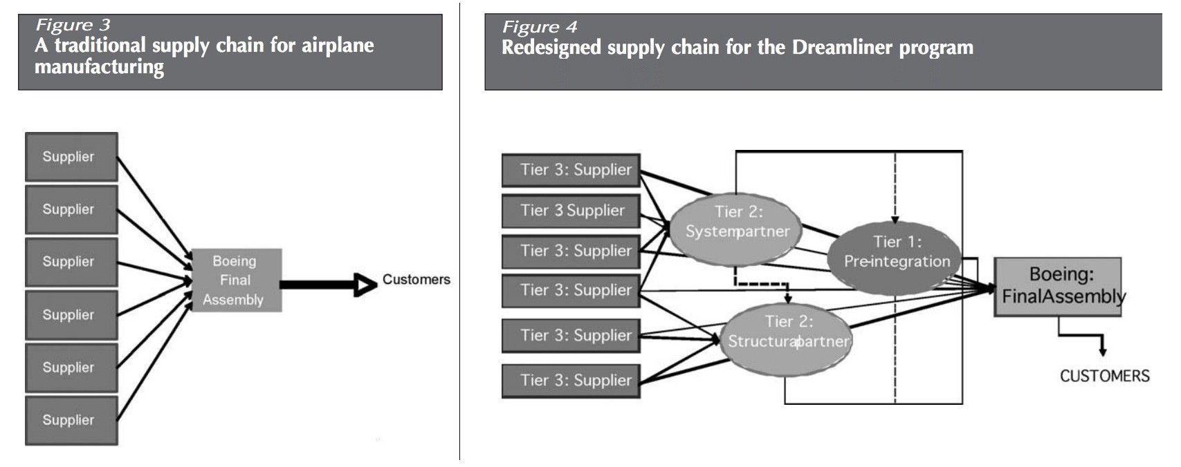 Figure 3 shows how a plane is traditionally assembled. Parts are outsourced, but they’re assembled by Boeing. Figure 4 was the new, financial engineering model. Assembly was viewed as a cost so that asset was outsourced as much as possible. When some executive presented this rats-nest on PowerPoint it showed immediately reduced costs, because Boeing was dumping a significant part of its brain.