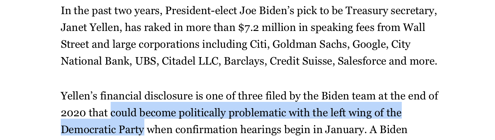 Politico notes down a shit-ton of bribes, and then frames it at some obscure political issue and not, you know, BRIBERY. This is precisely how American corruption hides in plain sight. No one’s paying your boring-ass Treasury Secretary to talk, but your press carries on like they are. Like this is totally normal. This is not normal. America is just totally corrupt. The usual excuse is that people collect bags when they’re out of office, but this just leads to a revolving door. As administrations change you just bribe the outgoing one, which’ll be back in later. Thus America has a unique sense of ‘policy continuity’. The policy is corruption.