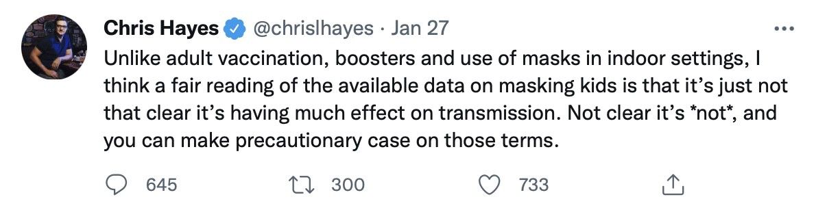 Someone like Chris Hayes is an elite literally paid to think about stuff like this, but what does he leave ordinary people with? He just sows self-confident doubt and then goes back to his triple-vaxxed, highly-tested bubble, proud of how smart he is. It’s dangerously dumb.