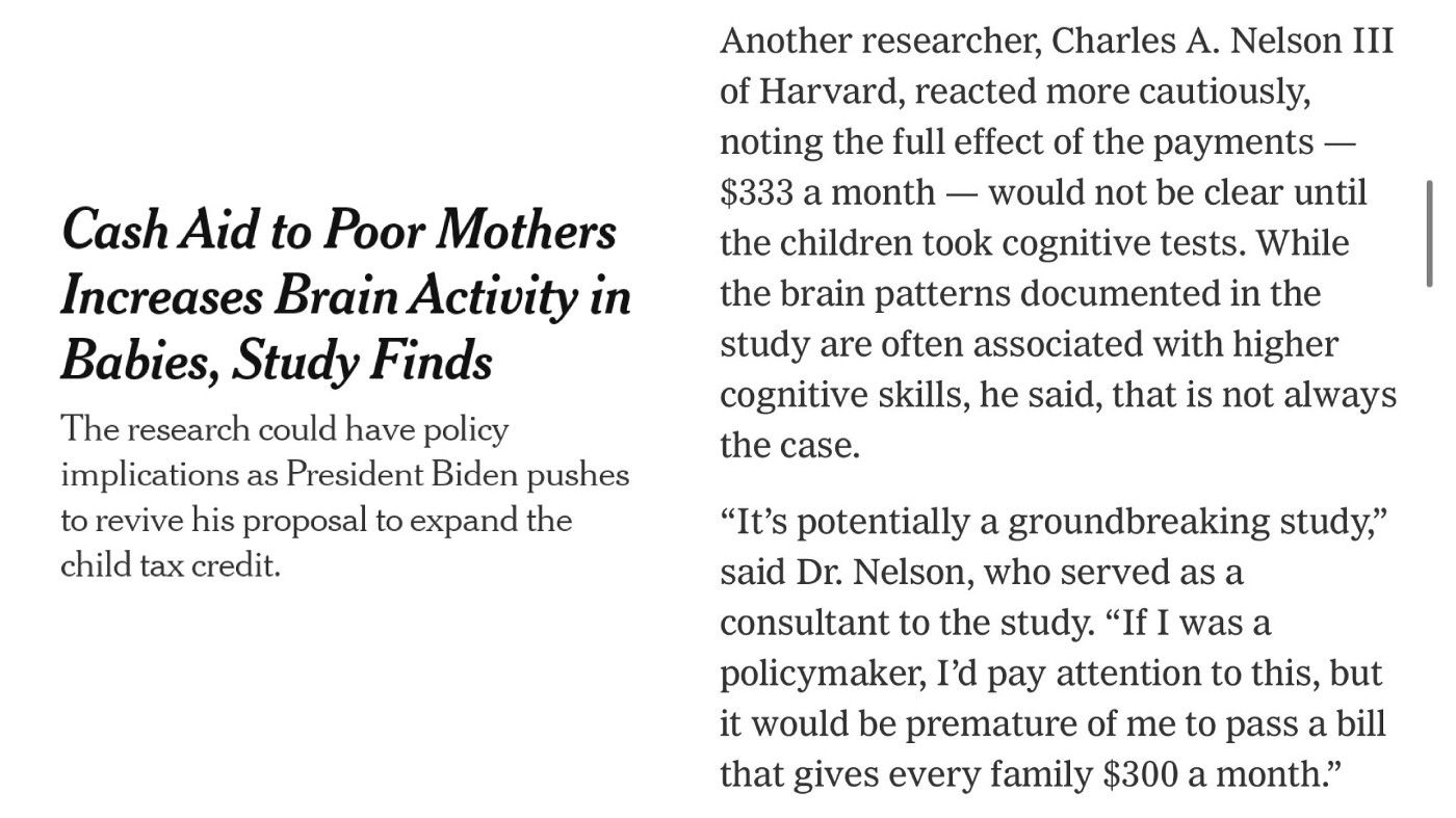Here’s the New York Times, owned by five generations of Och-Sulzbergers, and Charles A. Nelson the third asking whether maybe some generational help is good for children. I dunno, maybe just ask Charles A. Nelson I and II? Ask your great-great grandpappy? Was it fucking helpful for you?