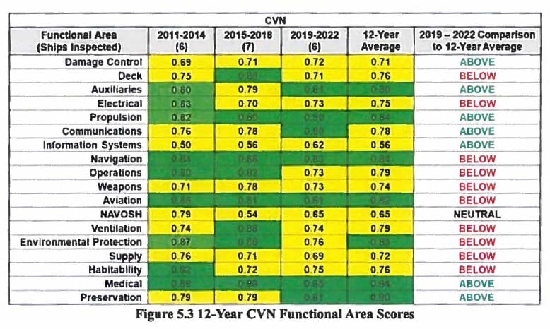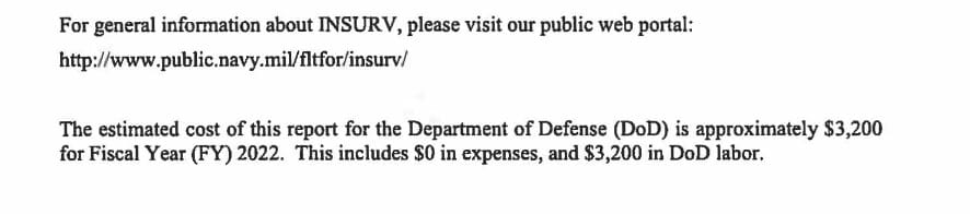By law (Title 10), every ship is supposed to be inspected every three years. The Eisenhower is six years overdue for its last inspection. In fact, nearly half of the entire fleet is overdue. As the latest INSURV report says, “As of 30 September 2022, there were 154 of 353 (43.6%) vessels, subject to inspection, that exceeded a 3-year inspection periodicity.” Which is to say half the fleet is missing regular maintenance, and none of it's in good shape. And all INSURV reports is the bare minimum. They report ‘does it have a gun?’ but not vital stuff like ‘does the gun fire?’ These auditors just kick the tires, they don't report combat drills, like whether the signal goes from the radar to the guns, etc. The total budget for the report is listed as $3,200 lol.