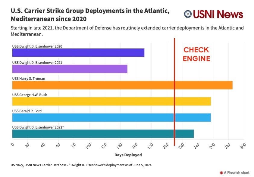 An aircraft carrier is really a floating vehicle with millions of other machines on it, all of which need maintenance. Also thousands of people, who are not magically revived by cookies. The iron law is that if you don't take care of your machines, your machines won't take care of you. And the Eisenhower is simply not fit for purpose. As its retreat from the Red Sea has shown.