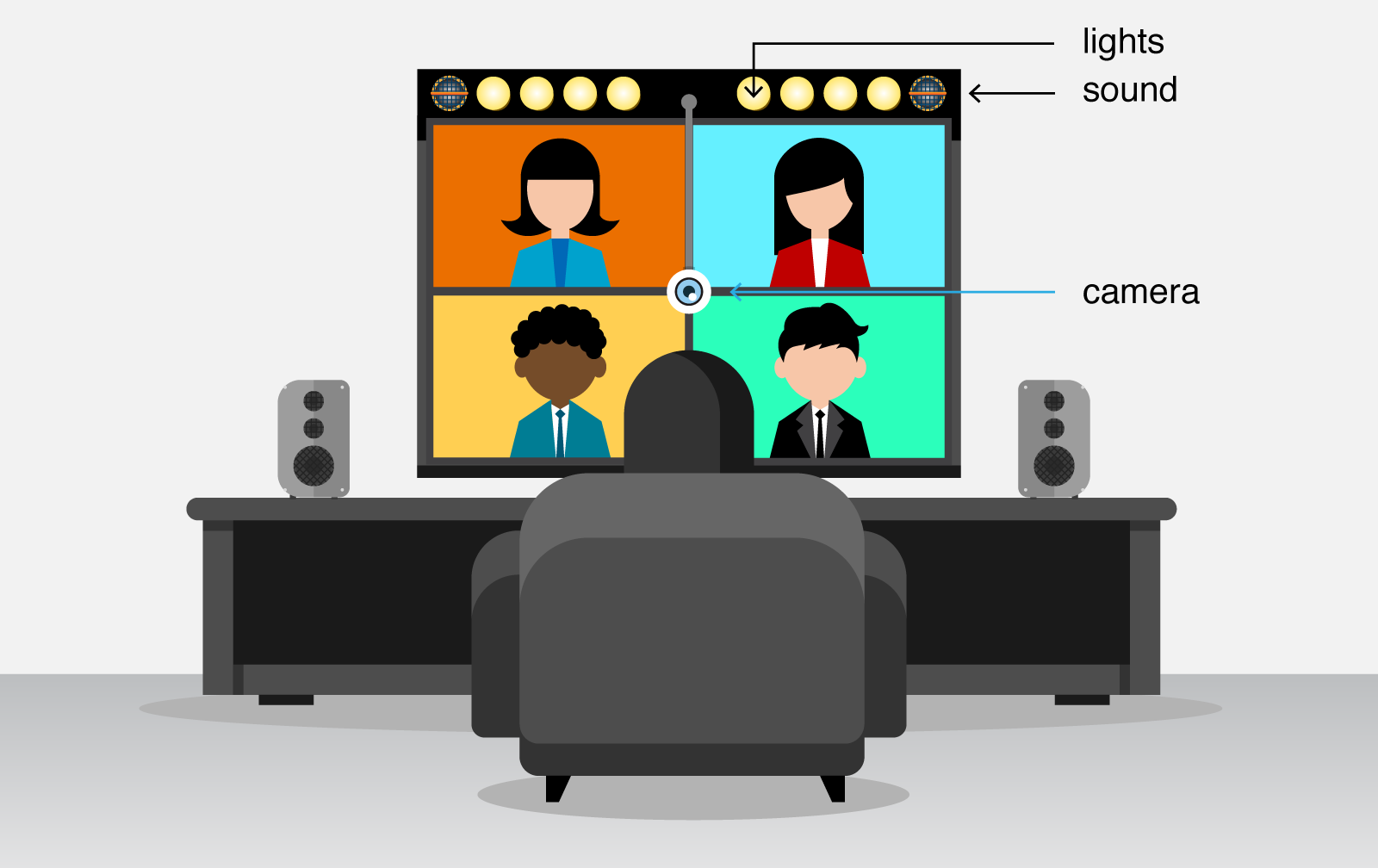 Picture something like a soundbar, but mounted above or, if you must, below your TV. This device would be an HDMI computer with built-in LED lights, shotgun microphones, and a webcam. In the illustration above I’ve made the webcam adjustable and dangly so you can bring eye contact back into these conversations.