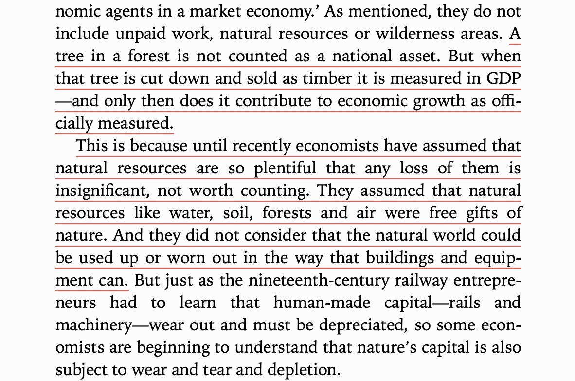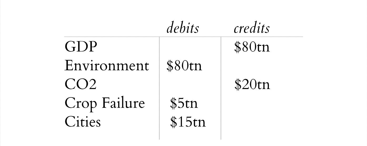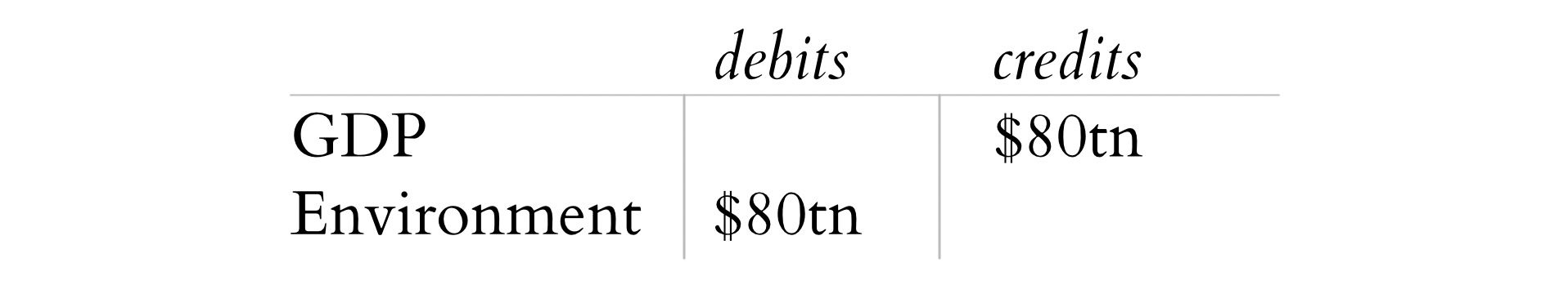 This isn't just morally bad, it's bad accounting. Not accounting for costs breaks the most basic principle of double-entry bookkeeping. The double-entry part. If you have a 'credit' like GDP, it has to have a corresponding 'debit' somewhere else. Like out of the environment. For example: