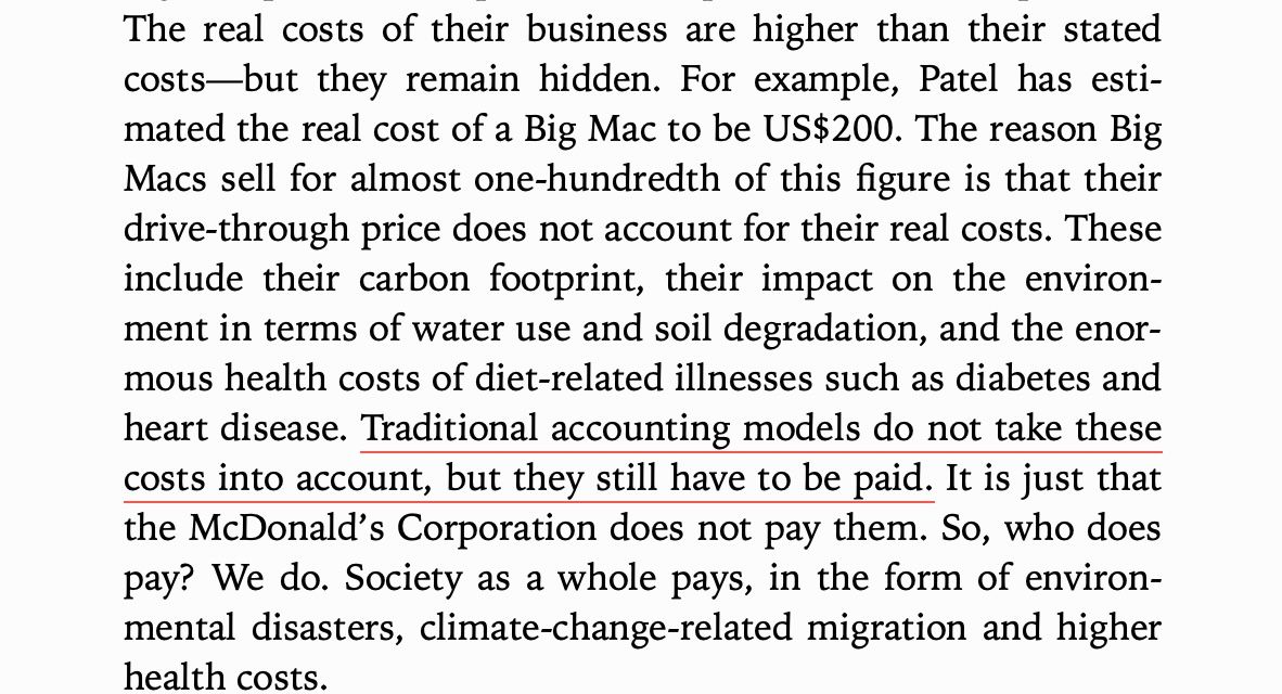 I'll call it fraud, because God knows they're making money on it. The level of fraud, across all of our economy, is staggering. Just take a Big Mac. Economist Raj Patel calculates that the actual cost of a Big Mac should be $200. That's how much cost we're leaving 'off the books'.