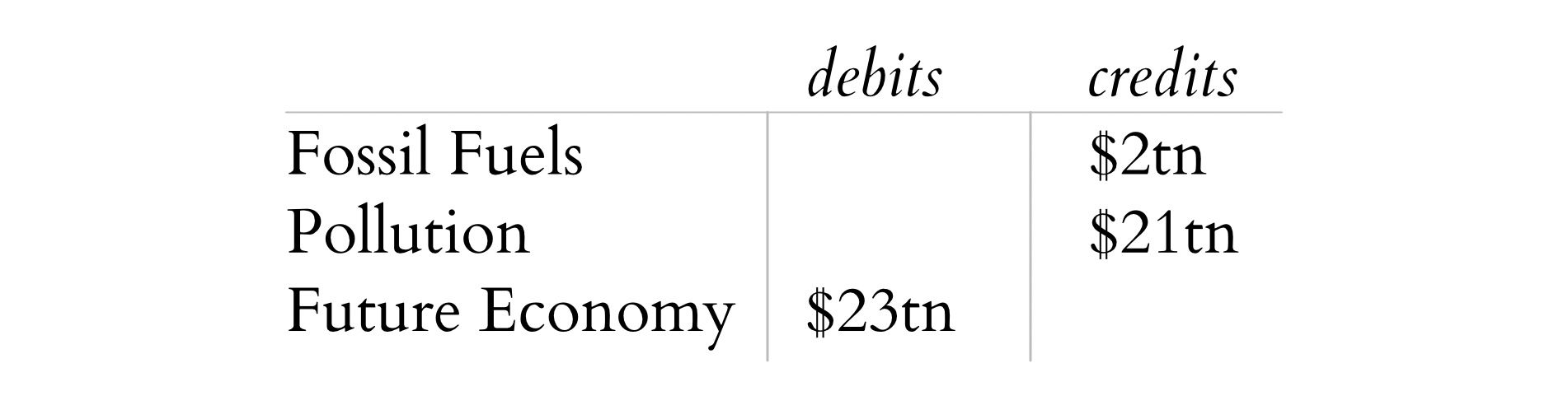If there was a real accounting, the books would look like this. Here's a journal entry for the profits of fossil fuel companies, including the costs: