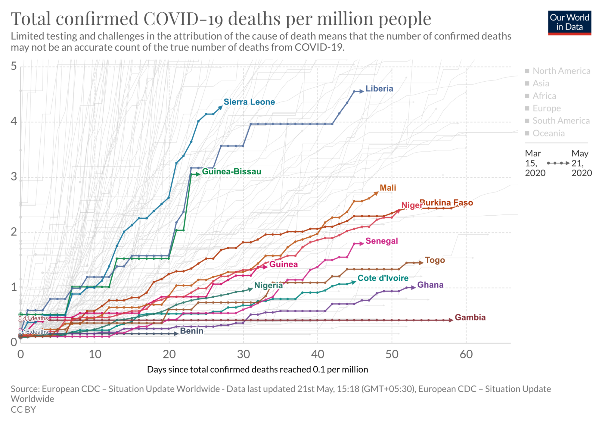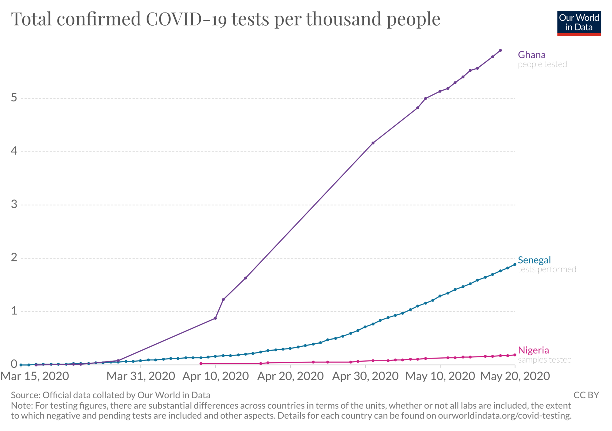 So now you see a different picture, where Ghana and Senegal are clearly ahead in suppression efforts because they’re testing more. Note that the other countries aren’t showing up because they haven’t released info that OurWorldInData can process. They are testing.