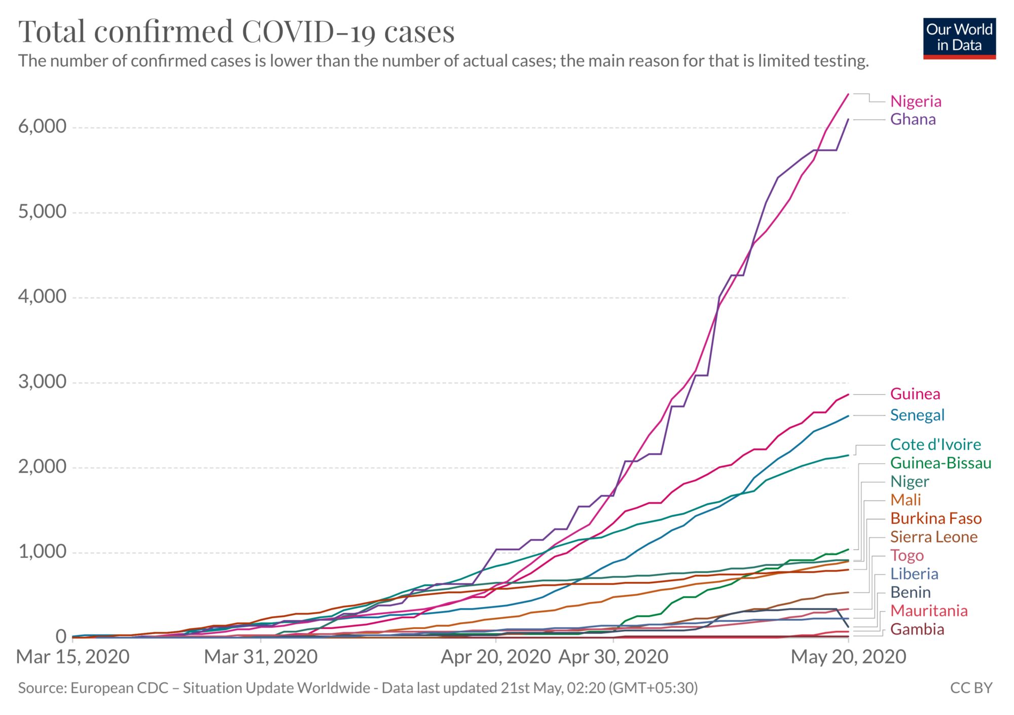 West Africa stretches from Senegal to Nigeria. Accra (Ghana) and Lagos (Nigeria) have over a dozen direct flights to Europe between them and connections to China through the Middle East, so they’ve been at risk, and indeed they have had infections for months.