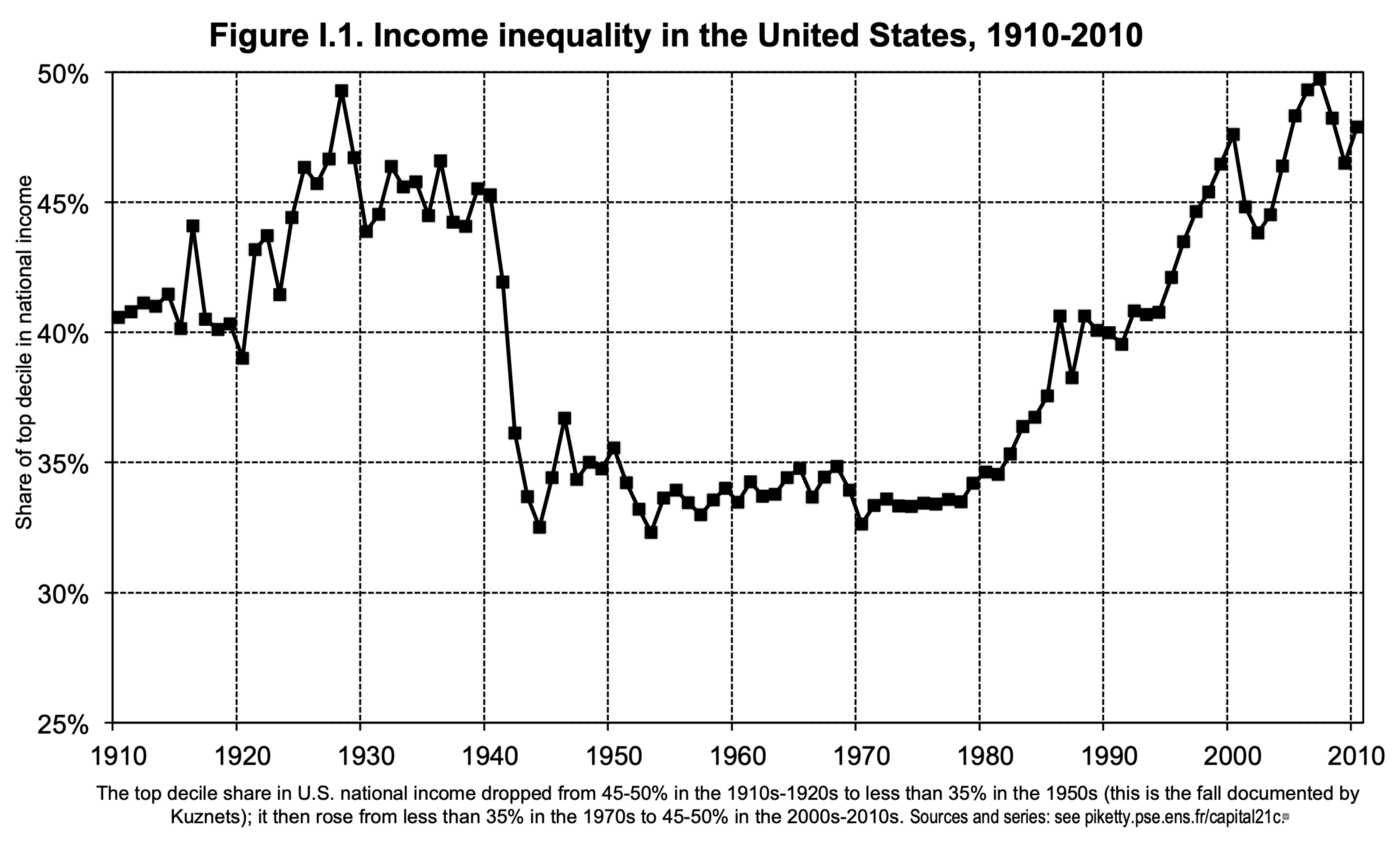 Today, American inequality is at pre-Great Depression levels, leading to great depression among the young. Just look at this graph from Thomas Piketty, who has a whole hefty tome on the subject: