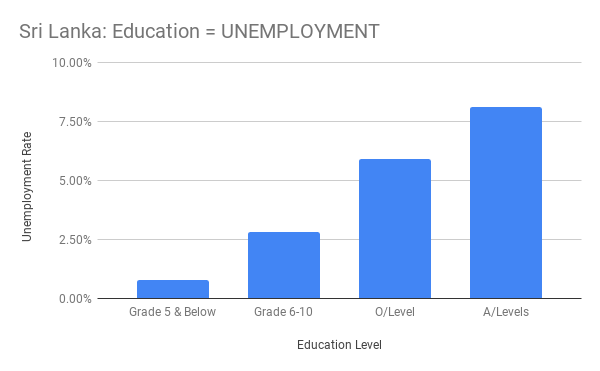 Today, however, I live in one of the few places where this curve is completely inverted. In Sri Lanka, educated people have higher unemployment rates. Statistically, you’re better off dropping out in 3rd grade, as my grandfather did almost 75 years ago. Something has gone terribly wrong.