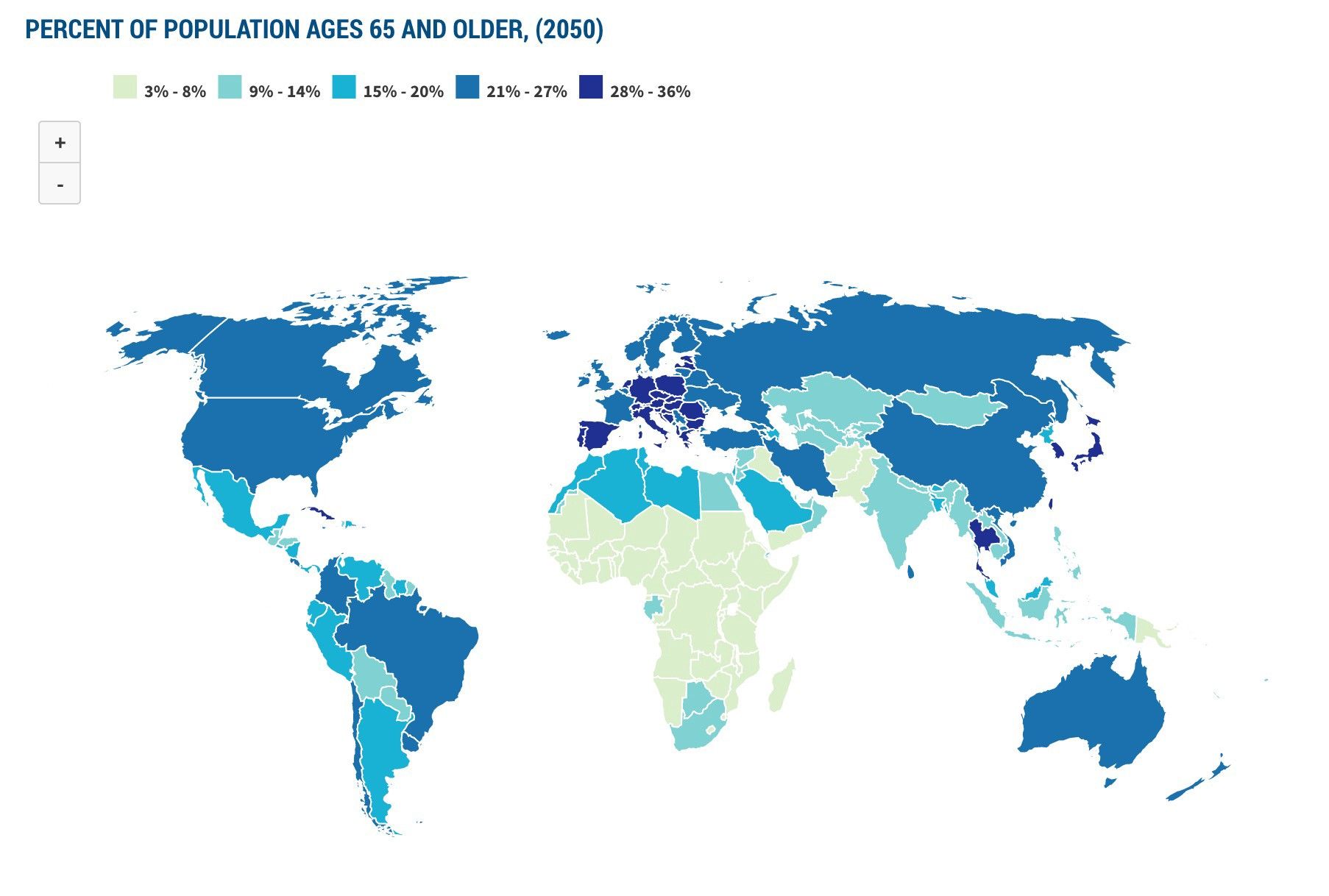This is really a story of two maps. This is a map of which populations will be old in 2050: