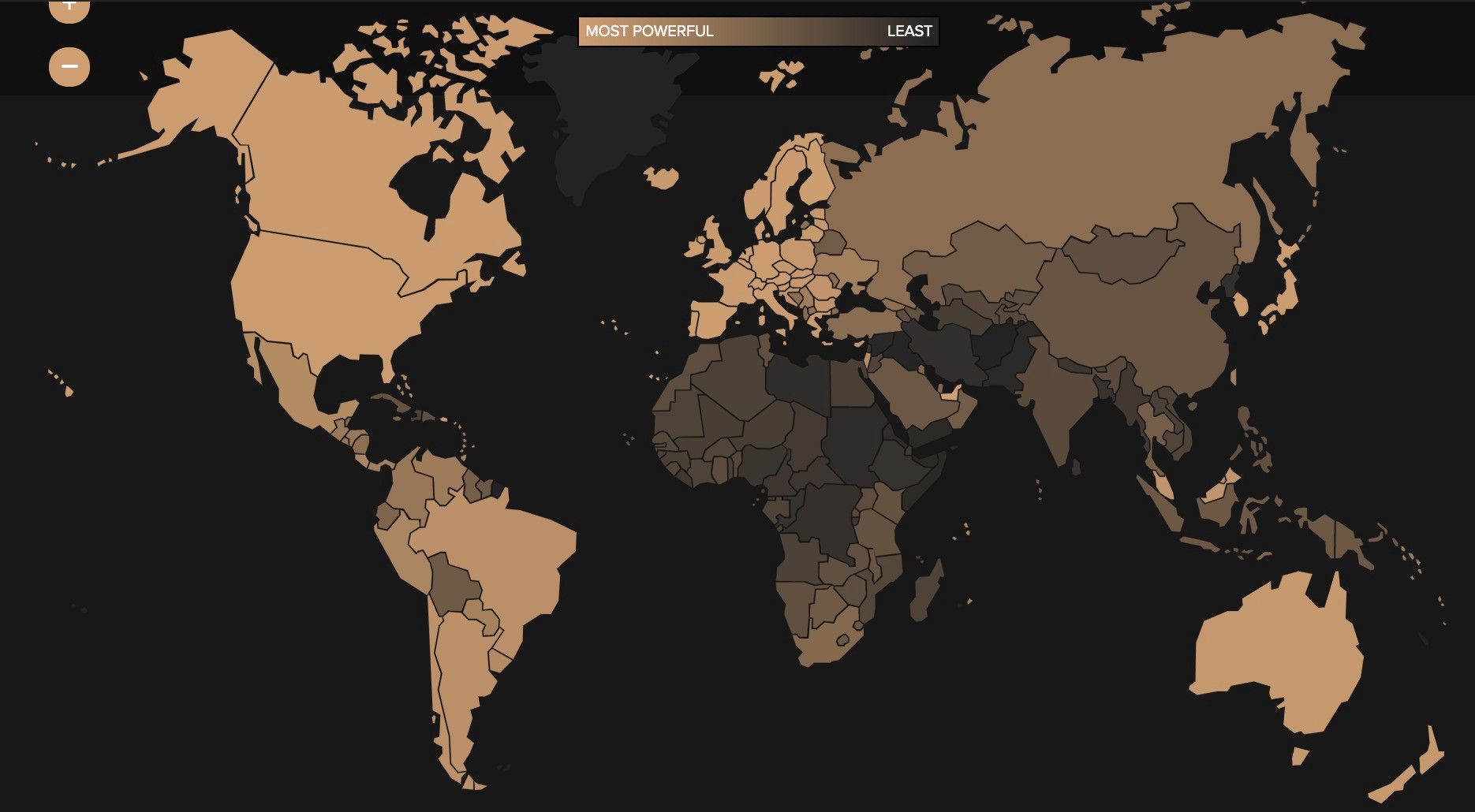 And below is the map of world’s shittiest passports, with the dark being bad because obviously. I’m using passports as a proxy for immigration controls because they’re connected and I don’t want to look for another map.