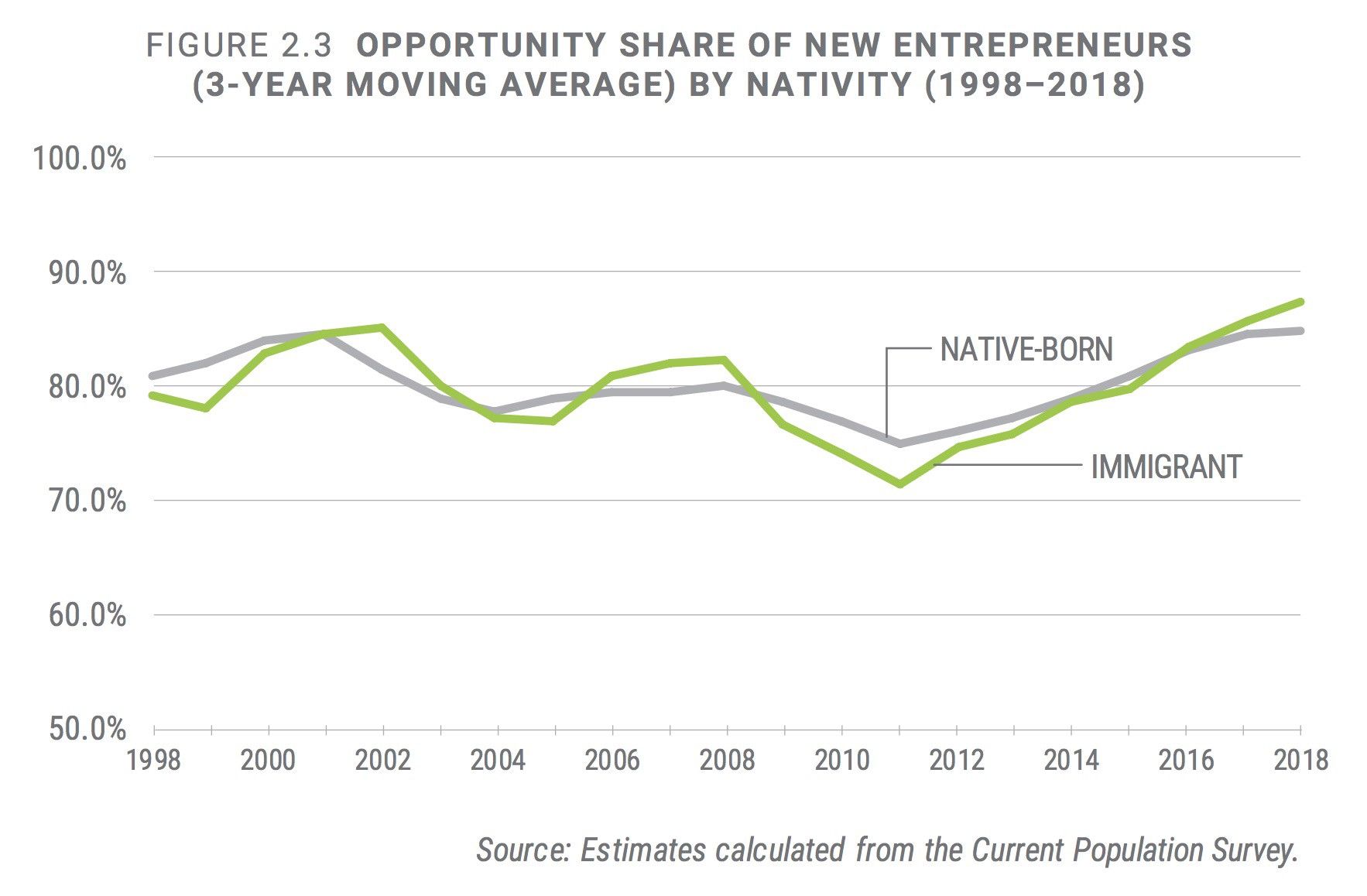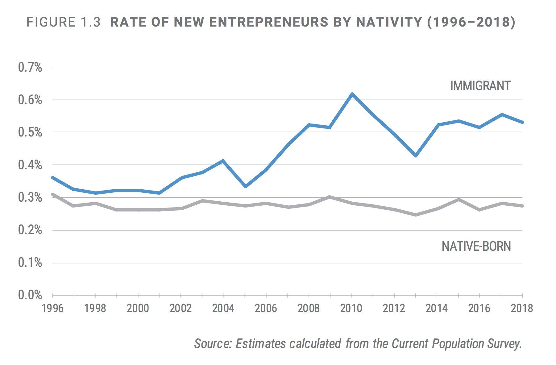 The Kauffman Foundation quantifies something called opportunity share, which gives a different picture. They define opportunity share as the people starting a business because they want to, not due to unemployment. If you look at that, native-born and immigrants start businesses at the same rate.
