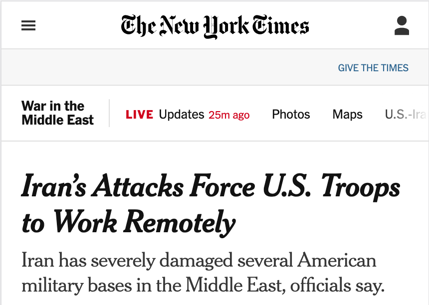 The NYCrimes sharticle that should have stayed a brainfart acknowledges this without acknowledging this. It says, “There were close to 40,000 U.S. troops in the region when the war started, and Central Command has dispersed thousands of them, some to as far away as Europe.” I think there's one English word for this and it's retreat. They also said, “Many of the 13 military bases in the region used by American troops are all but uninhabitable.” This can also be described in one word, defeat. Truth is the first casualty of war, and I guess language is the second. Not content with massacring of children, these people are massacring their own language.