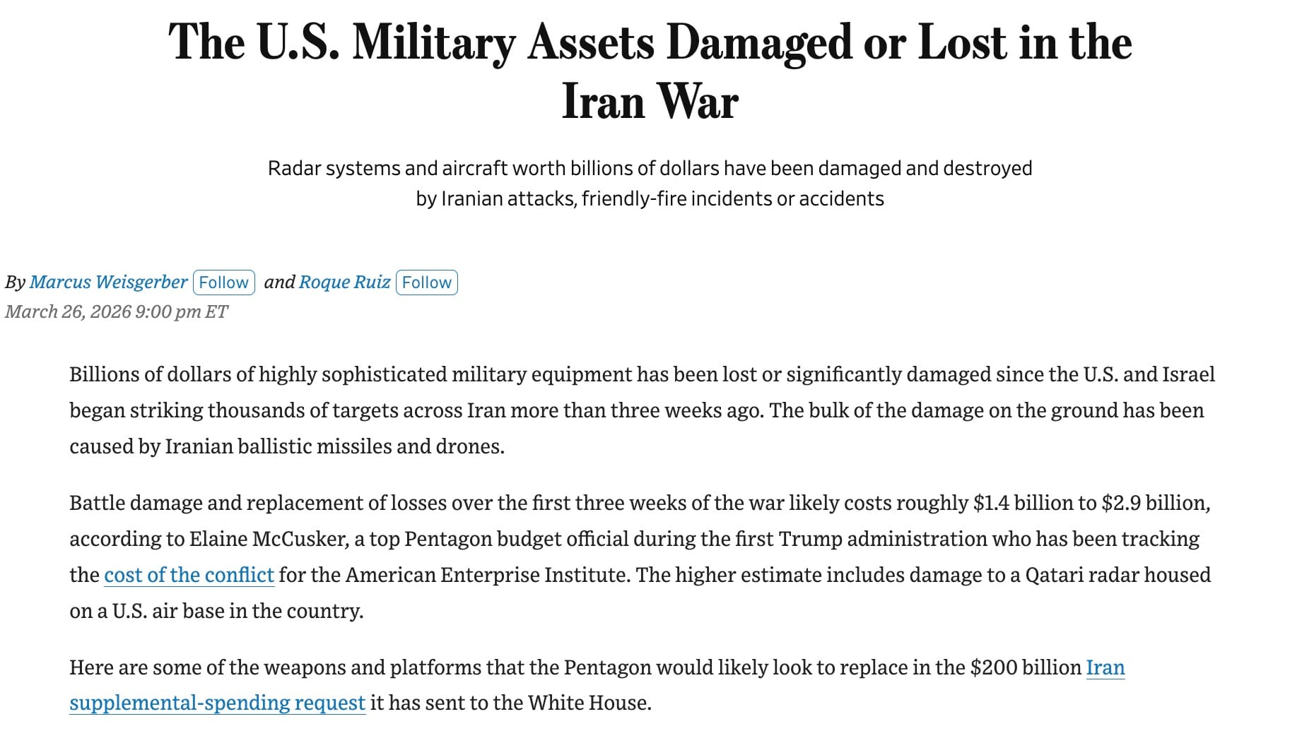 The readiness rate of 'America's' antiquated fleet (how often equipment can be used without breaking down) is bad in the best of times, and these are the worst of times, where they have nowhere to land and do maintenance. 'America's' problems compound the longer this goes on, and Iran just has to hang around. This level of attrition is not a winning proposition, according to the Empire's own calculations.