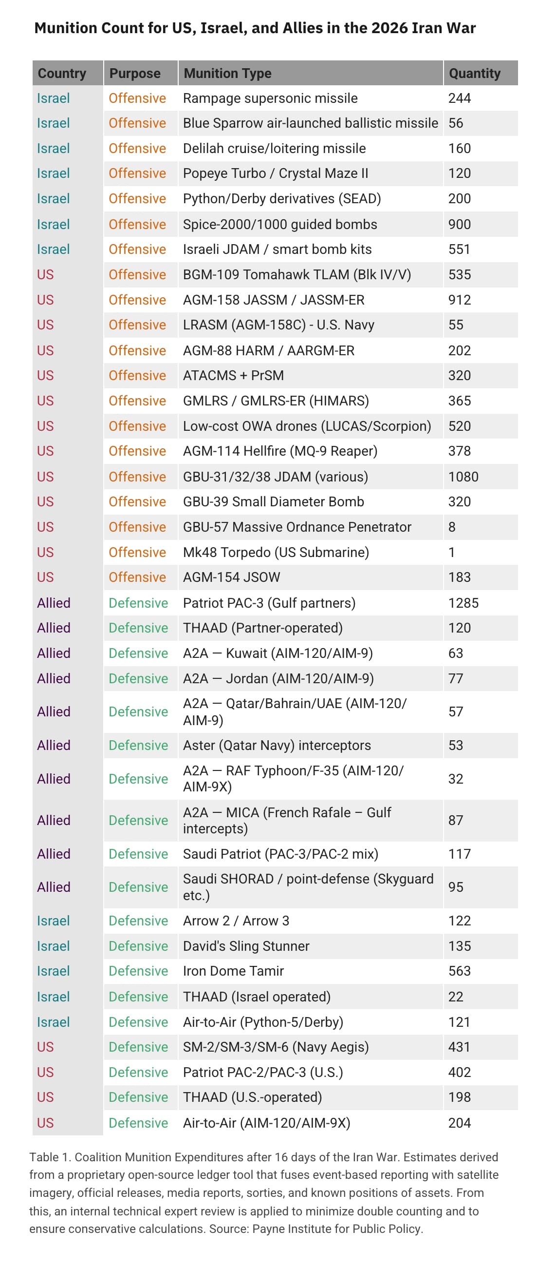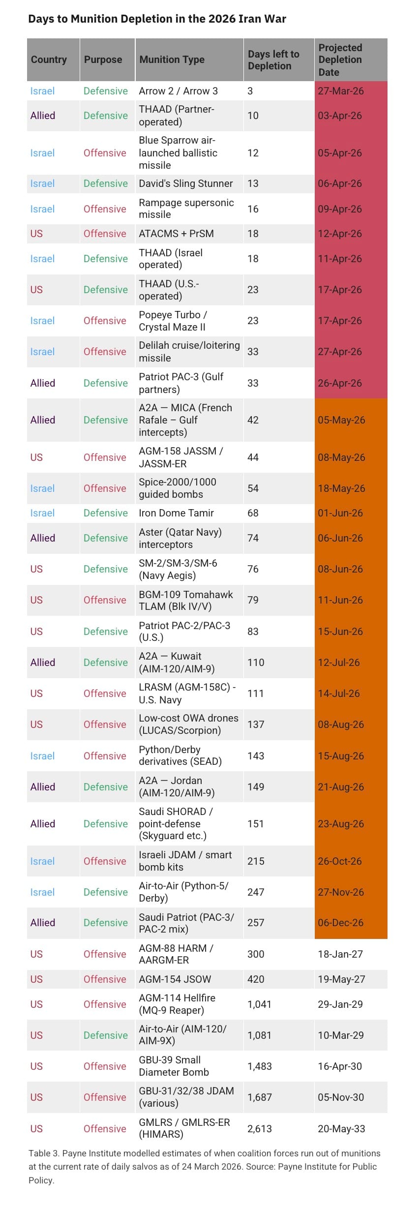 RUSI (which is some British stink-tank, not Russian), says “over a dozen munition types have been expended by the coalition at a rate that appears to be unsustainable. Already, Rheinmetall CEO Armin Papperger noted on 19 March that global stockpiles are ‘empty or nearly empty’ and that if the war continues another month ‘we nearly have no missiles available’.” Iran knows this as much as anyone.