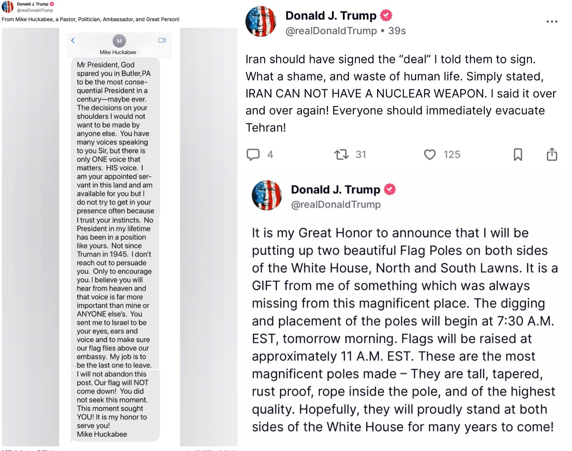 His Dumbassador Mike Huckabee explicitly makes the connection to Truman nuking civilians in 1945, and the Christian Zionist view that they need to hurry God and bring on the apocalypse (very antichristlike). Unlike the USSR, which collapsed peacefully in complete control of its nukes, the USA is collapsing violently, and God knows what they'll do. I am a god-fearing man and God knows I fear nukes. I'm also Buddhist but Sinhalese are notoriously syncretic, leave me alone. May Allah be with Iran, and guide them in everything they do.