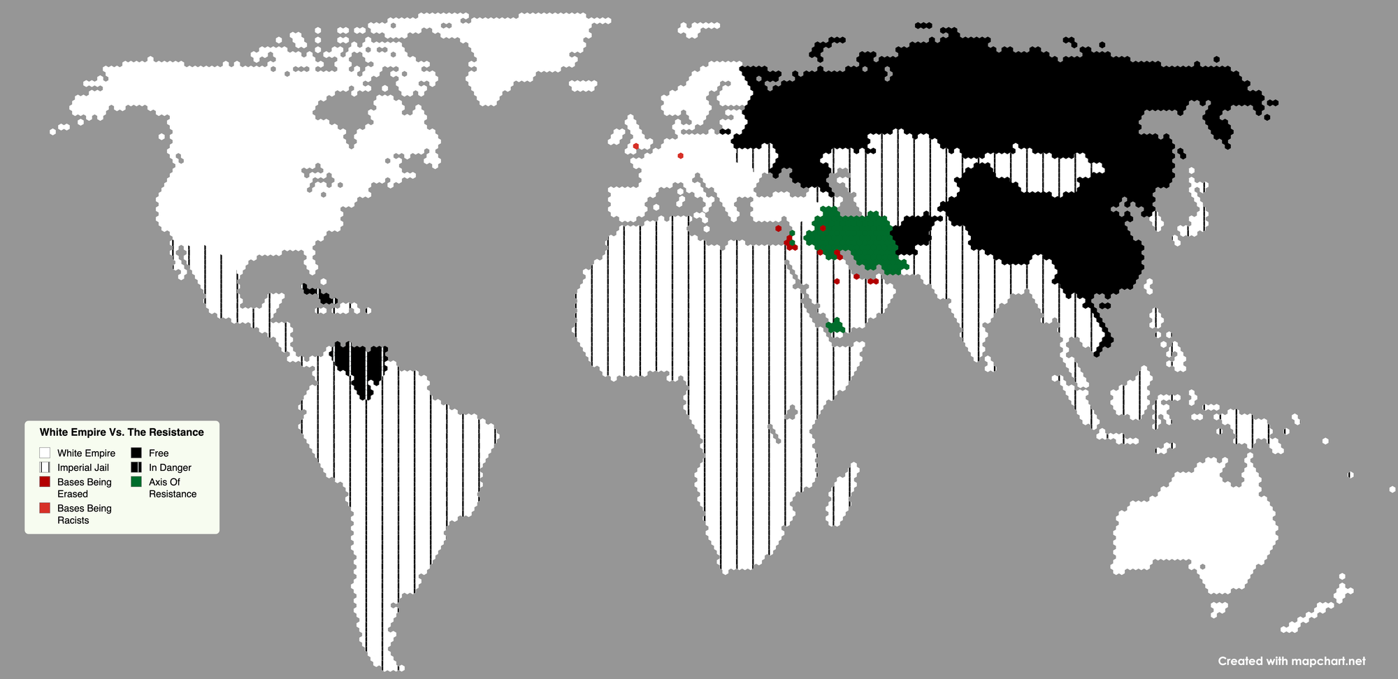 Some nations have declared sovereignty and paid dearly. These are the people fighting White Empire (Russia, Iran, Palestine, half of Yemen), those who fought it off (Vietnam, North Korea, Afghanistan), and the places Empire would love to fight but is scared of (China). Venezuela and Cuba were free, but I now mark them as in danger.