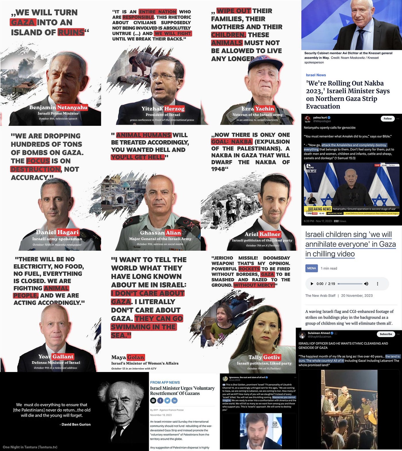 Genocidal incitement aside, you can tell from their actions. Israel targets hospitals, homes, bakeries, and water tanks; everything they can destroy to make Gaza unlivable. They have been killing children (the average age of casualties is 5) to crush the Palestinian spirit and destroy any future resistance. Israel is waging genocide, with the full backing of the original genociders in America and Europe.