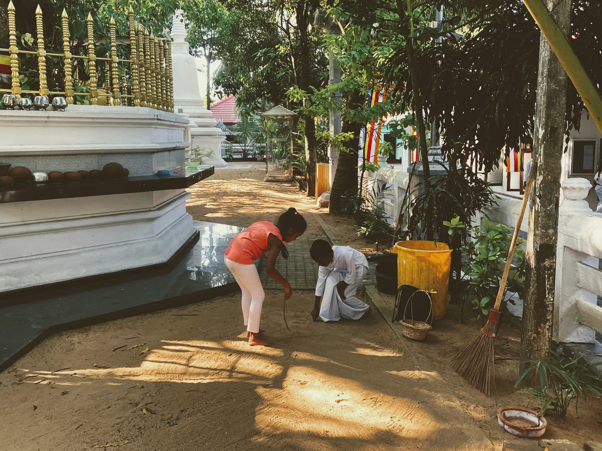 Temples are palpably cooler than the street, they smell better, and they're beautiful. Almost every temple is shaded by a big Bodhi Tree—a sapling of the tree that shaded the Buddha—and this one is no exception. We can smell the incense and take off our shoes to walk in the sand. A little boy is cutting daham pasal ('Sunday' School) and he 'shows us around'. He leads us down some dead-end alley behind a house where a monk yells at us and then laughs. My mother says this child was obviously too naughty for daham pasal and now we're naughty by association.