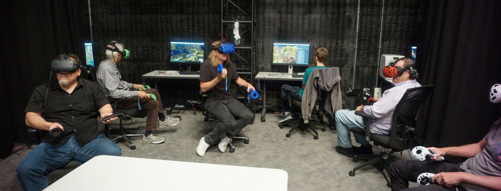 Instead of going to Africa, his crew went to a virtual world to shoot ‘real’ footage. They’re sitting in a room on office chairs, using VR headsets. They have fake cameras, dollies and lights that they move around, setting up and filming shots in a virtual world. Then we watch the scenes in 2D. It’s not a VR film but it is filmed in VR.