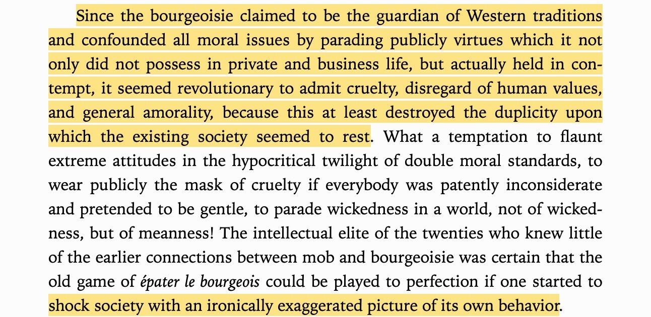 Hannah Arendt—writing about pre-Nazi Germany, etc—wrote that honestly evil fascists at least offered a relief from the "pious banalities" of the bullshitting bourgeoisie. She said that the speeches of people like Trump were "were actually the attitudes and convictions of the bourgeoisie cleansed of hypocrisy."