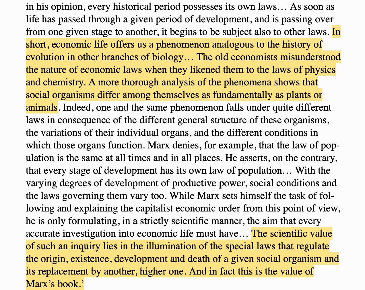 “The scientific value of such an inquiry lies in the illumination of the special laws that regulate the origin, existence, development and death of a given social organism and its replacement by another, higher one. And in fact this is the value of Marx’s book.”