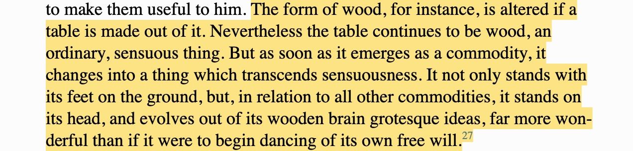 So is Marx himself not subject to this determination? Is he writing history, or is history writing him? This is all the more reason to take Marx literally when he talks about Capital as a lifeform. Even unconsciously, this is truth being expressed through him. For example when Marx says "the products of the human brain appear as autonomous figures endowed with a life of their own, which enter into relations both with each other and with the human race" I simply take him at his word. When he says a table "evolves out of its wooden brain grotesque ideas," I don't laugh at the absurdity. I live in absurdity. I take this as fact.