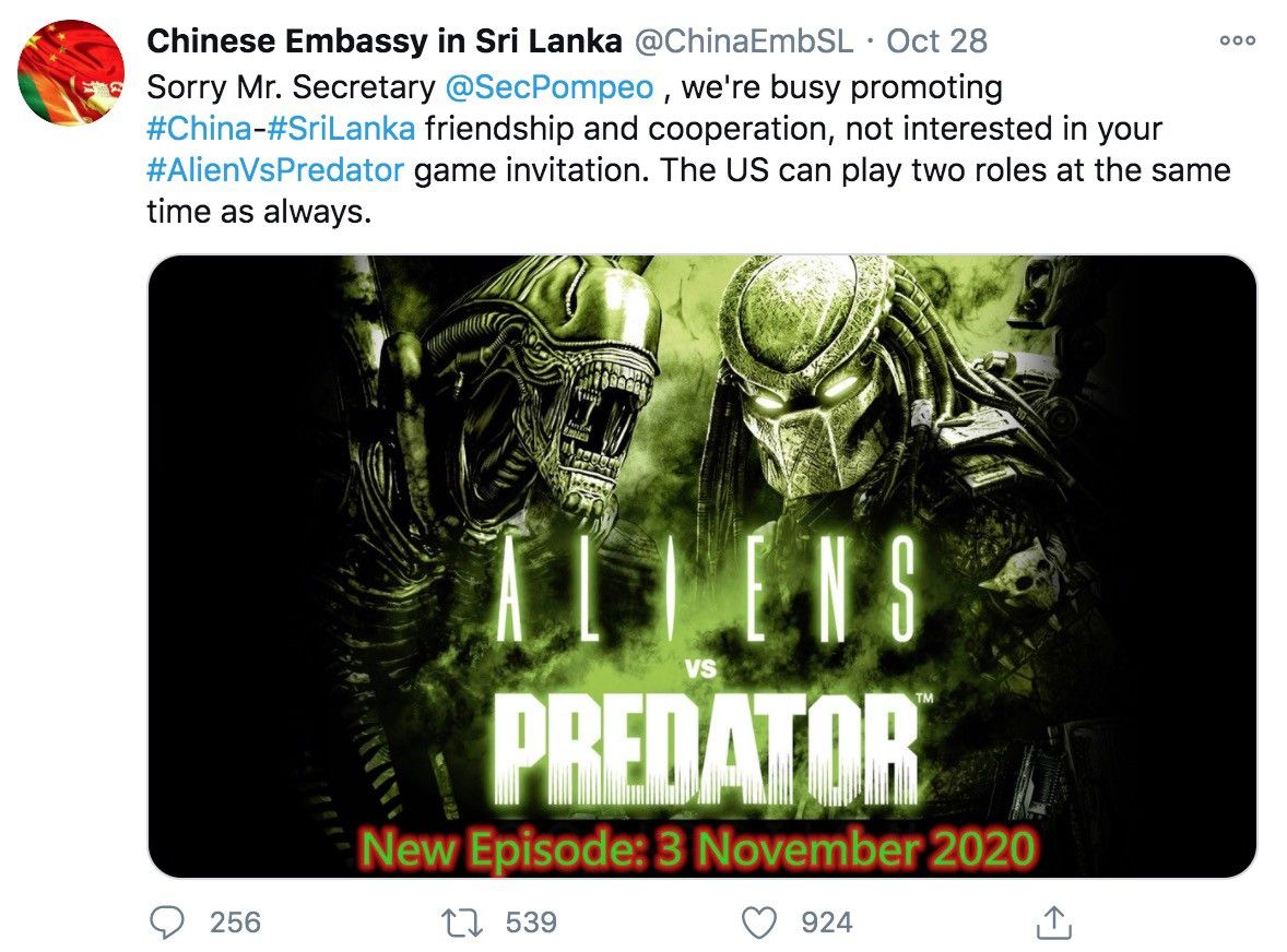 When Pompeo came to Sri Lanka he just trolled China. Our President had to push back. So did Indonesia. This is not normal, and does fuck all to help us. It just plays to the US audience at home. Pompeo showed up for 12-hours, shitposted about our neighbors and left. Meanwhile everyone that met him has to get a swab to the brain.