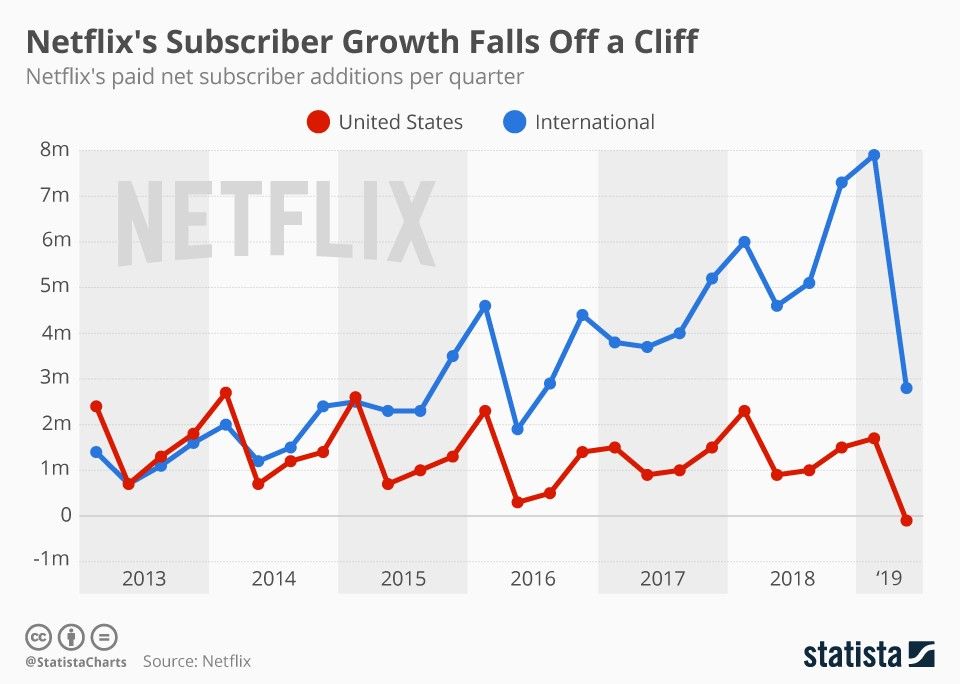 Netflix ended the quarter with a cliffhanger. Well, not really. They just fell off a cliff. International growth stalled and they lost a net 130,000 subscribers in the US.