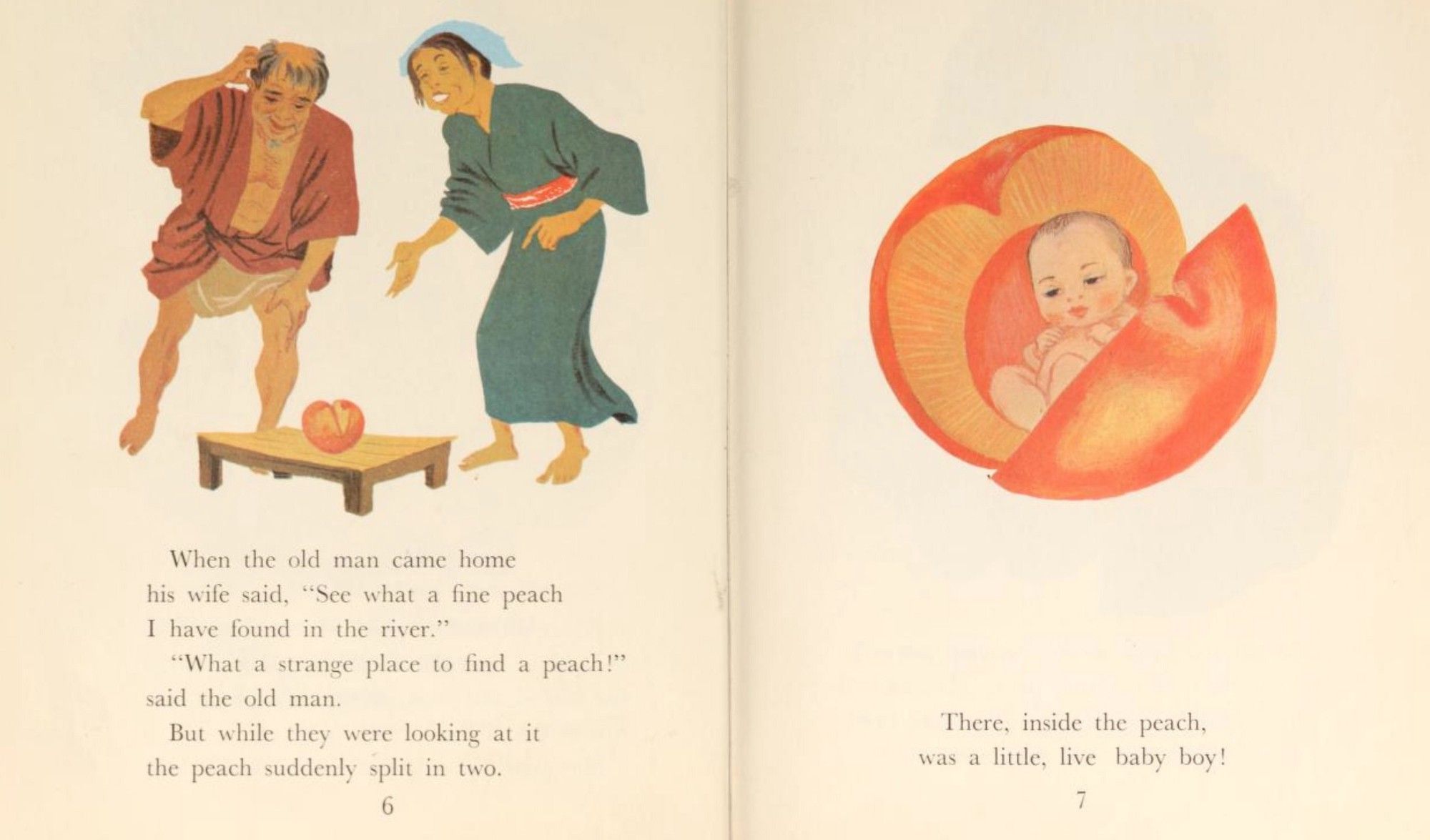 In the actual story, the old couple welcomes Momotaro, who is a wonderful child. Momotaro goes on to defeat the wicked Oni (bandits) and comes back with a bunch of treasure. The parents have a comfortable retirement.