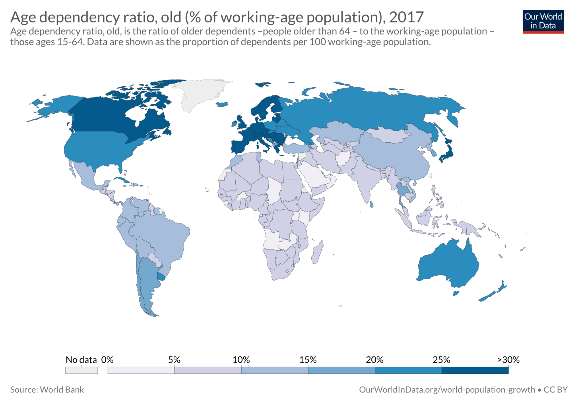 Developed nations are literally dying. This is a map of age dependency ratios around the world. The blue countries are demographic black holes, where more old people are drawing resources from less young.