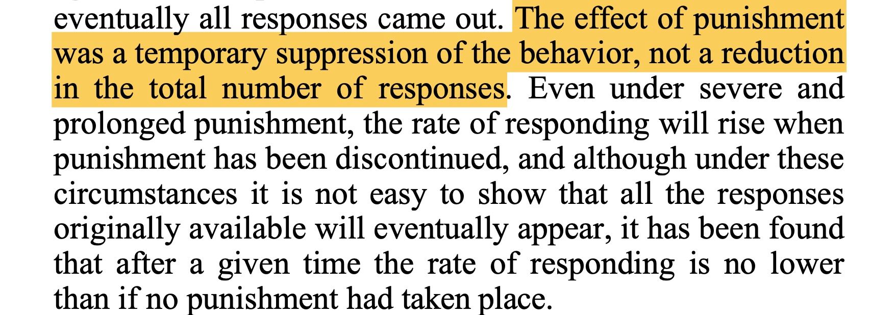 The effect of punishment was a temporary suppression of the behavior, not a reduction in the total number of responses. Even under severe and prolonged punishment, the rate of responding will rise.