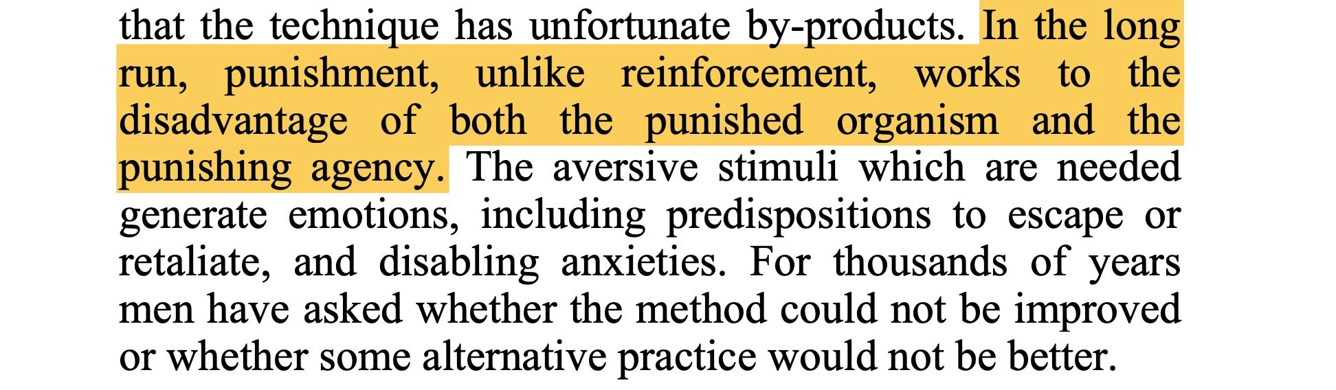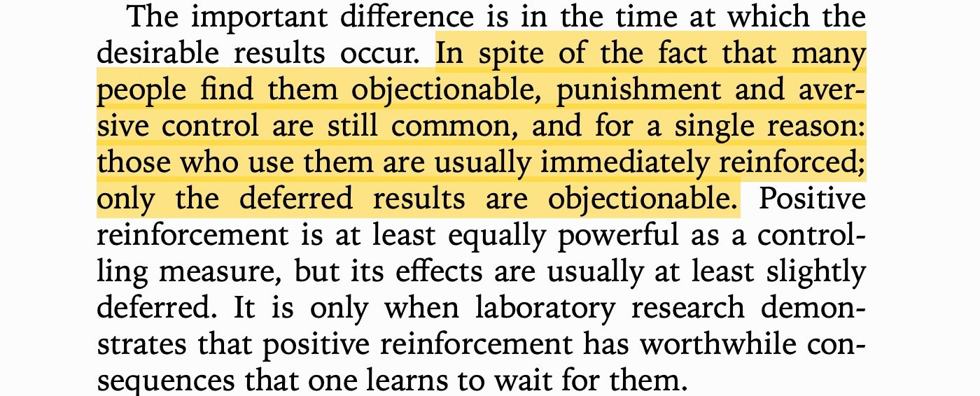The allure of punishment is that it immediately seems to work. If you shock a rat for pressing a lever, it will stop pressing that lever. However (especially if there's an underlying cause for the behavior), when you stop shocking, the behavior will come back. As Skinner said in Science and Human Behavior (1965), any behavioral change is temporary. Punishment doesn't change real-world behavior. It forces you to maintain a new world of pain.