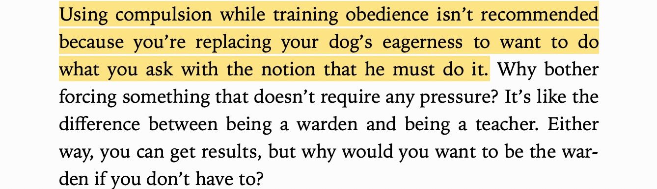 McMillan talks about the difference between being a warden (imprisoning your dog) and a teacher (helping them). No dog trainer advocates throwing a dog in a cage for bad behavior (crate training is never used as punishment). Every dog trainer calls for building trust, using positive reinforcement, and taking time.