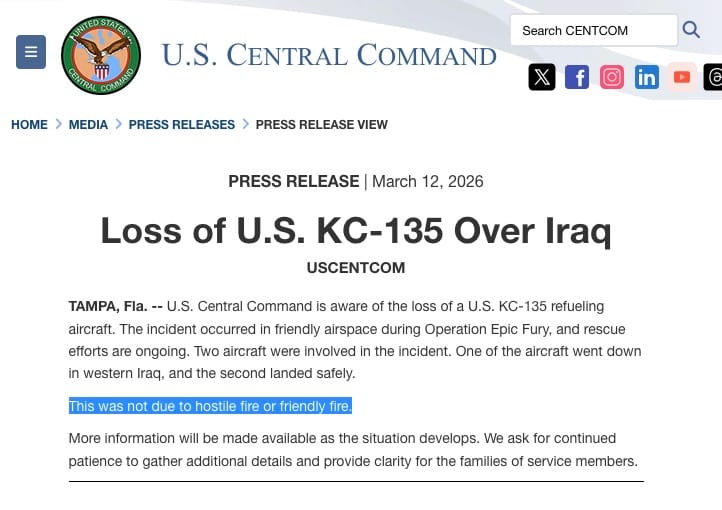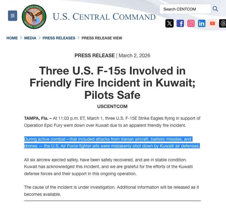 We have three F-15s down in Kuwait and now a KC-135 down in Iraq, and those are just admitted kills. We'll go by CENTCOM's own admissions for now because they're telling. I will also call them FENTCOM, because it's funny.